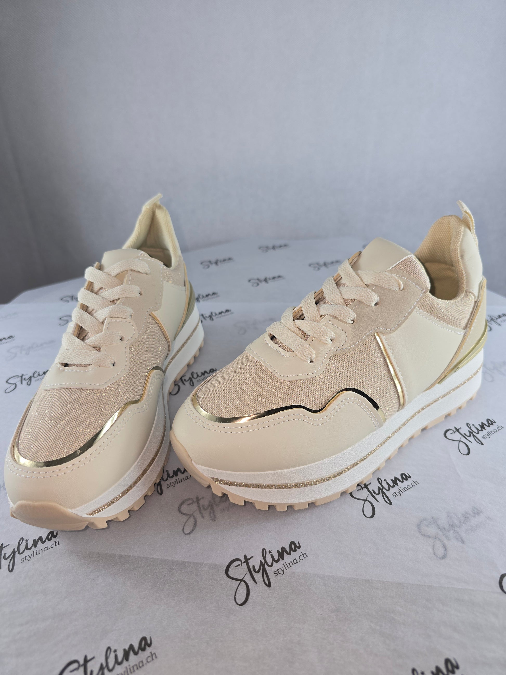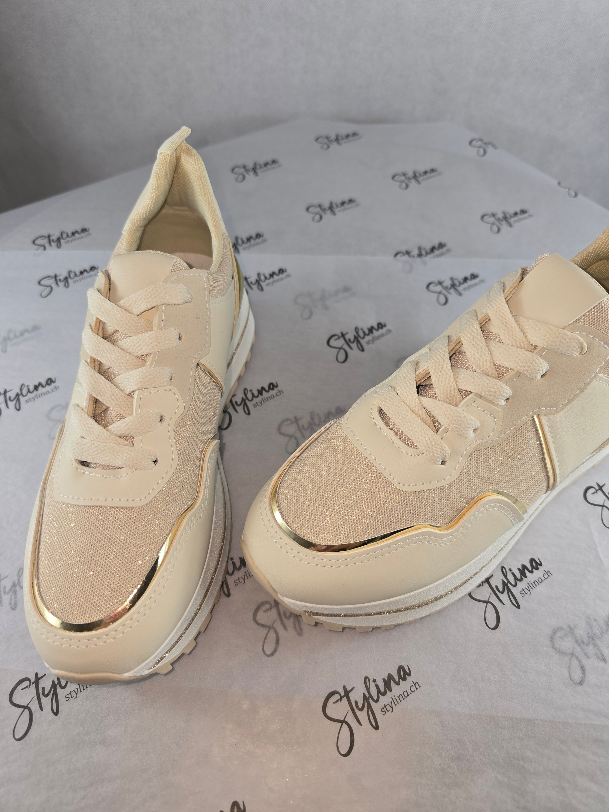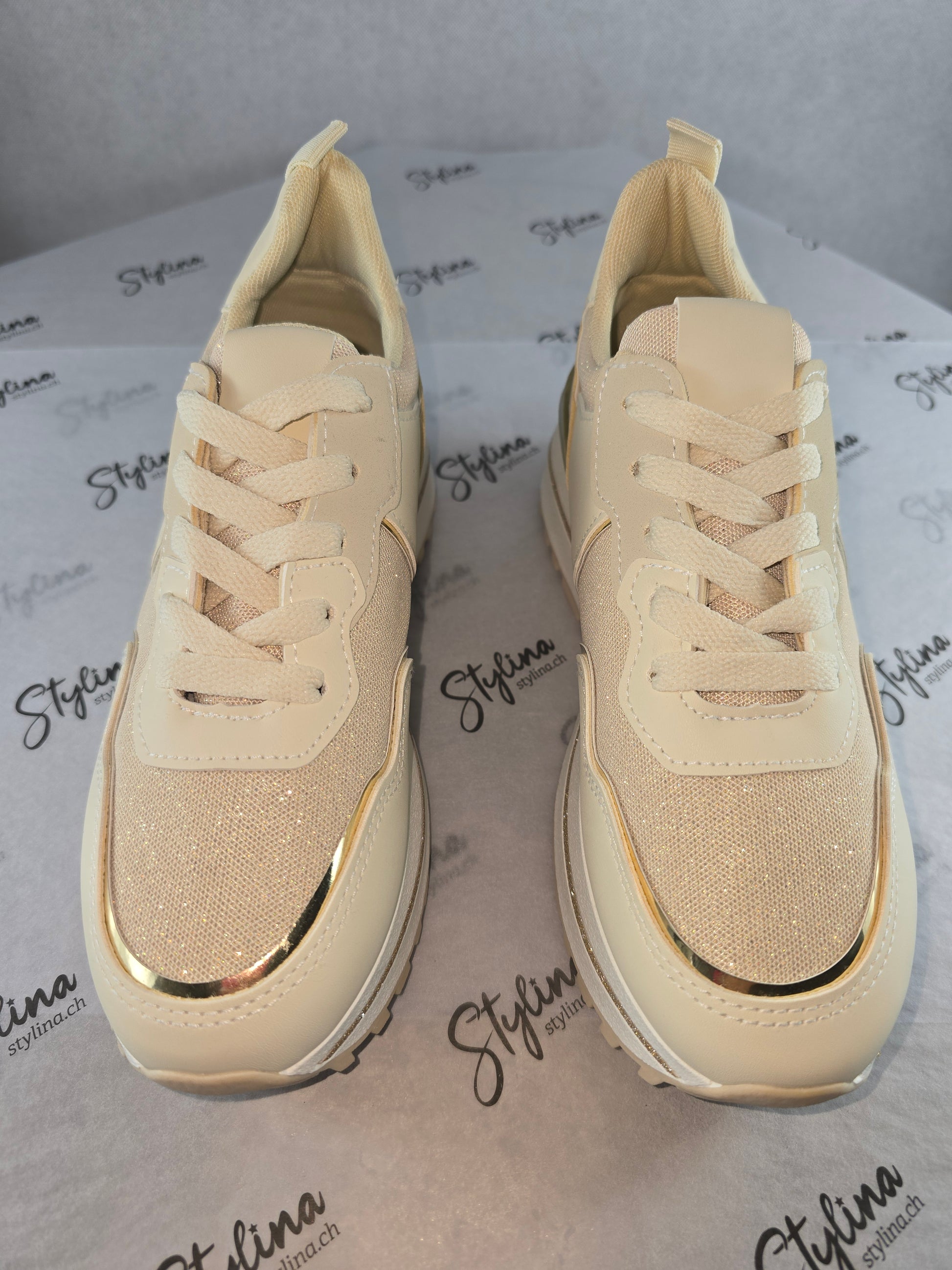 Baskets beiges à détails dorés – Chic & confort