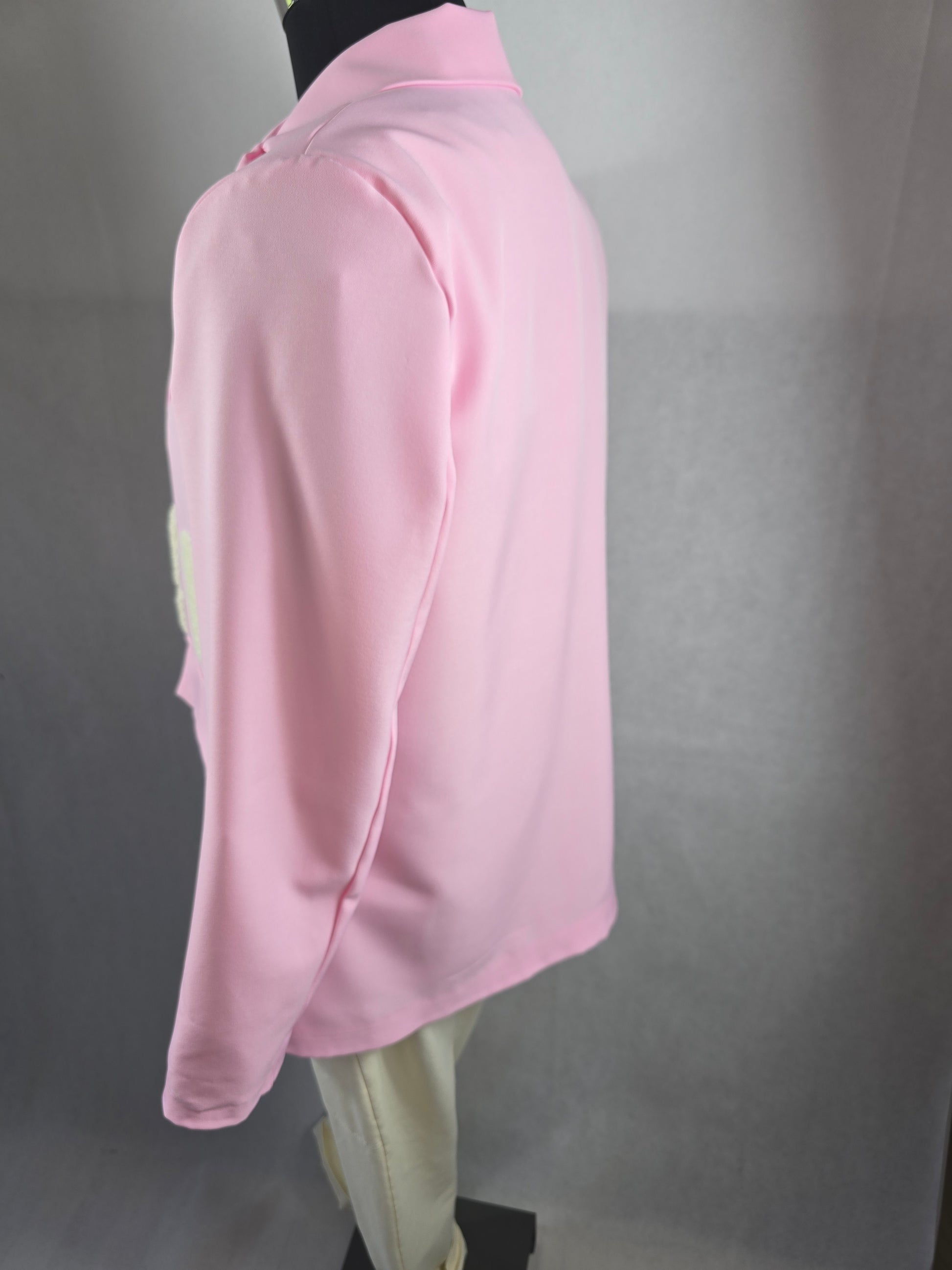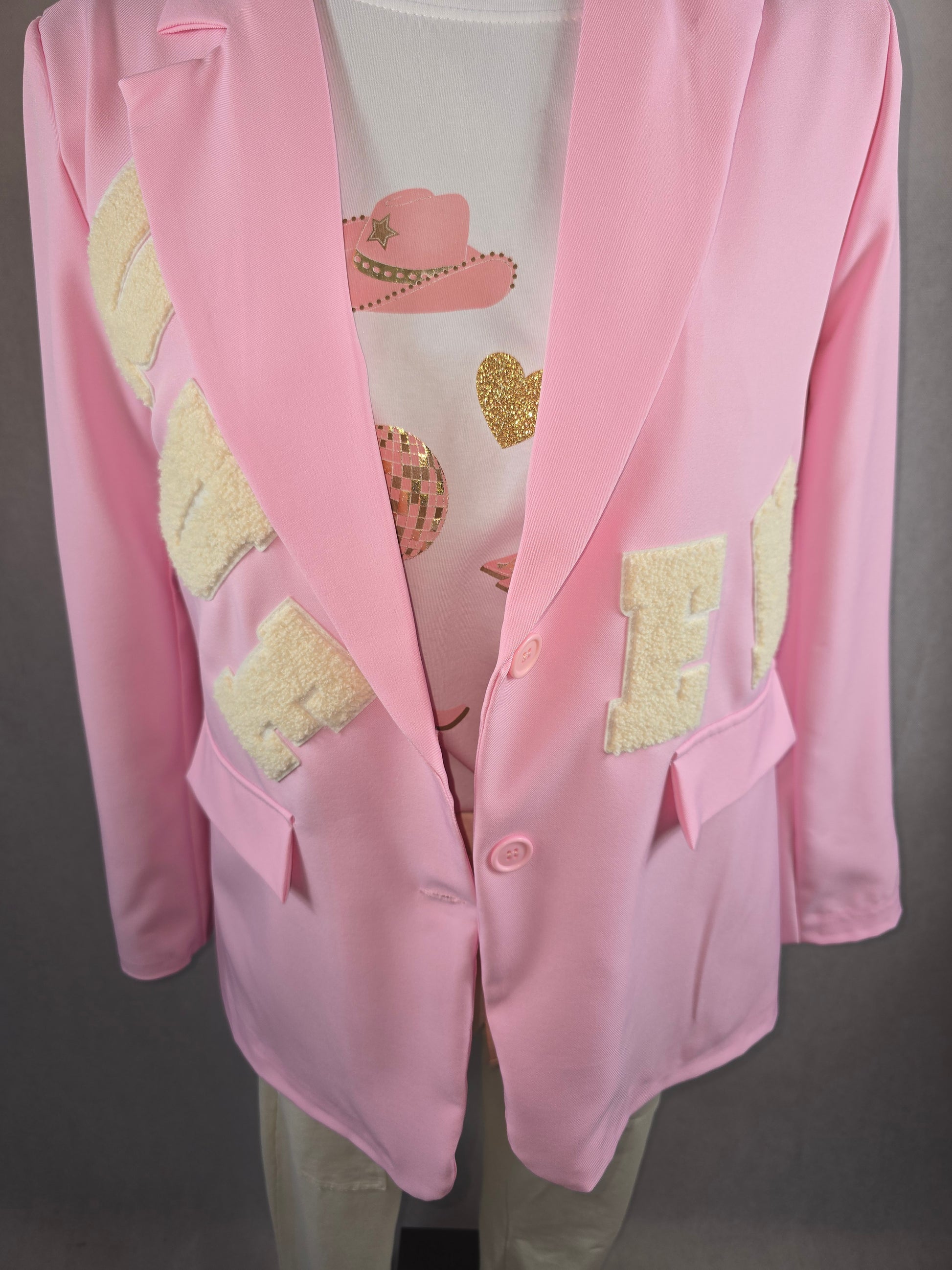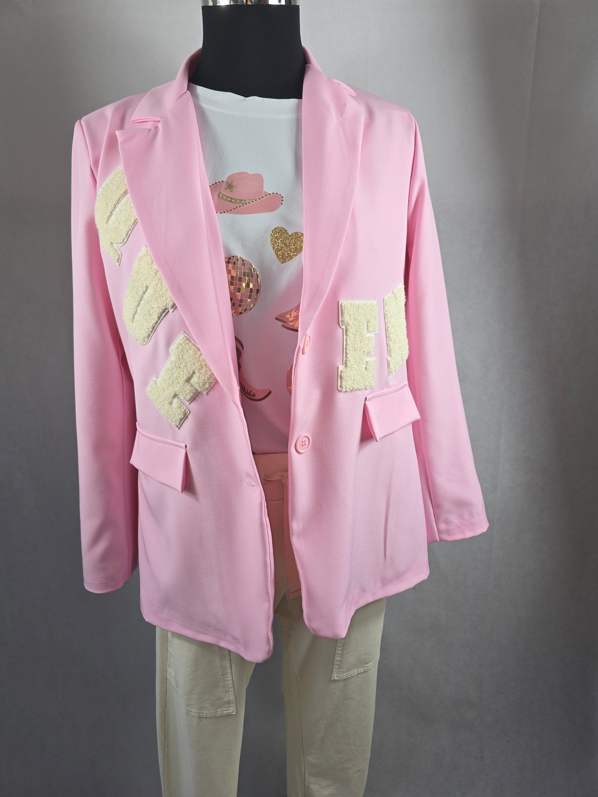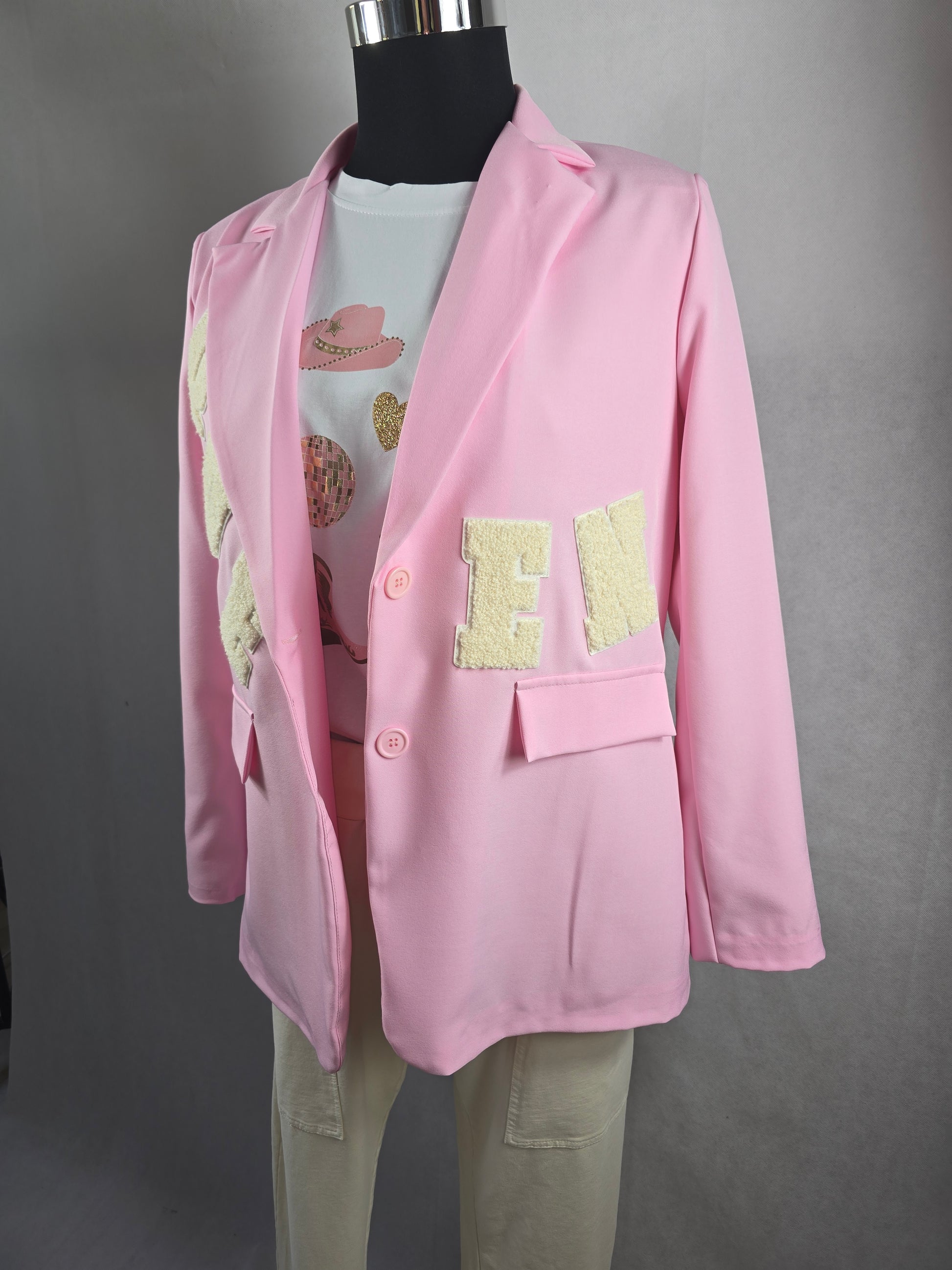 Affirmez votre style avec ce blazer rose audacieux ! Ses appliqués "QUEEN" en bouclette crème sur le devant apportent une touche originale et très tendance. Parfait pour dynamiser une tenue simple ou compléter un look plus élaboré. Confortable et chic (50% polyester, 50% viscose).