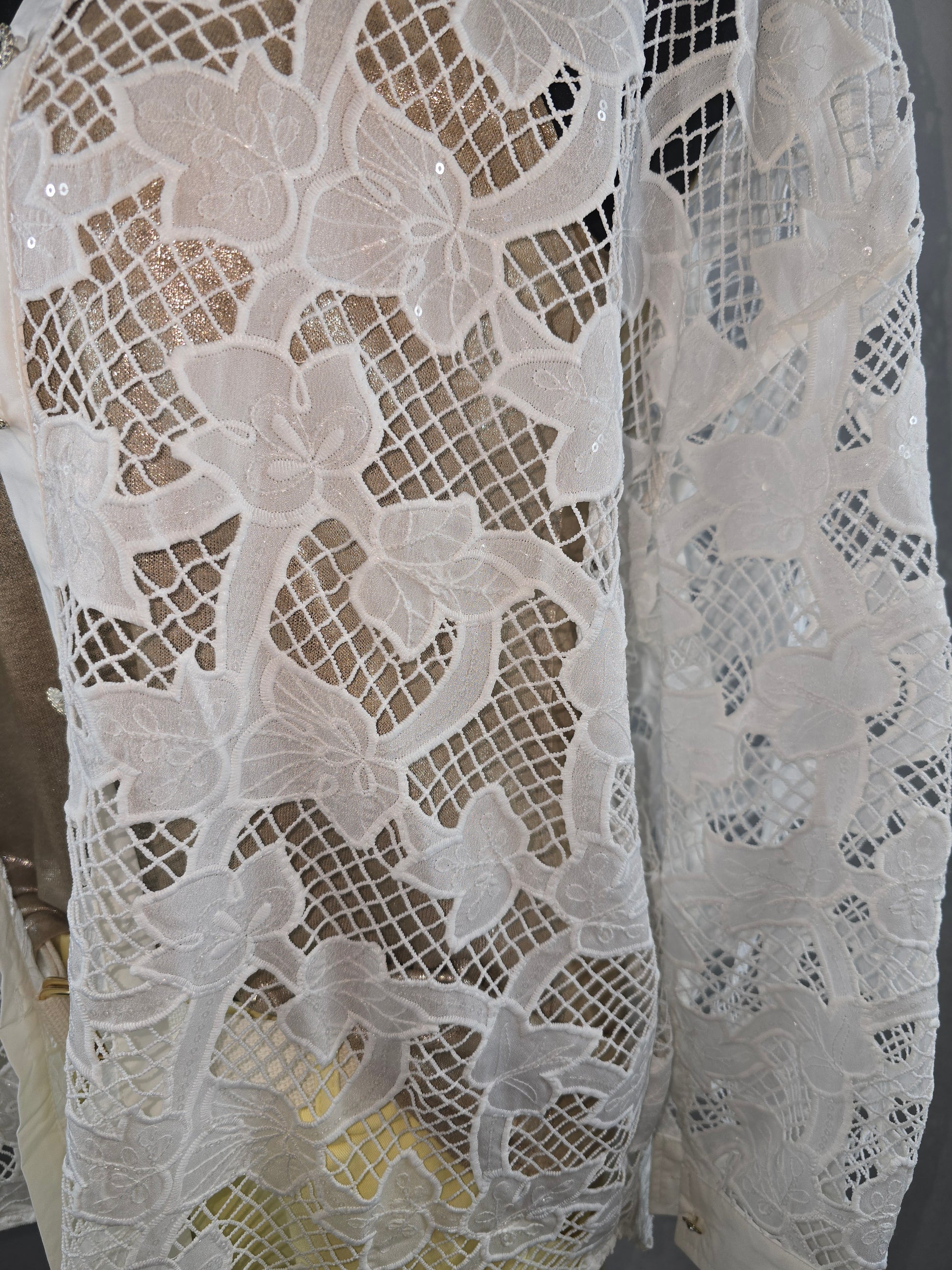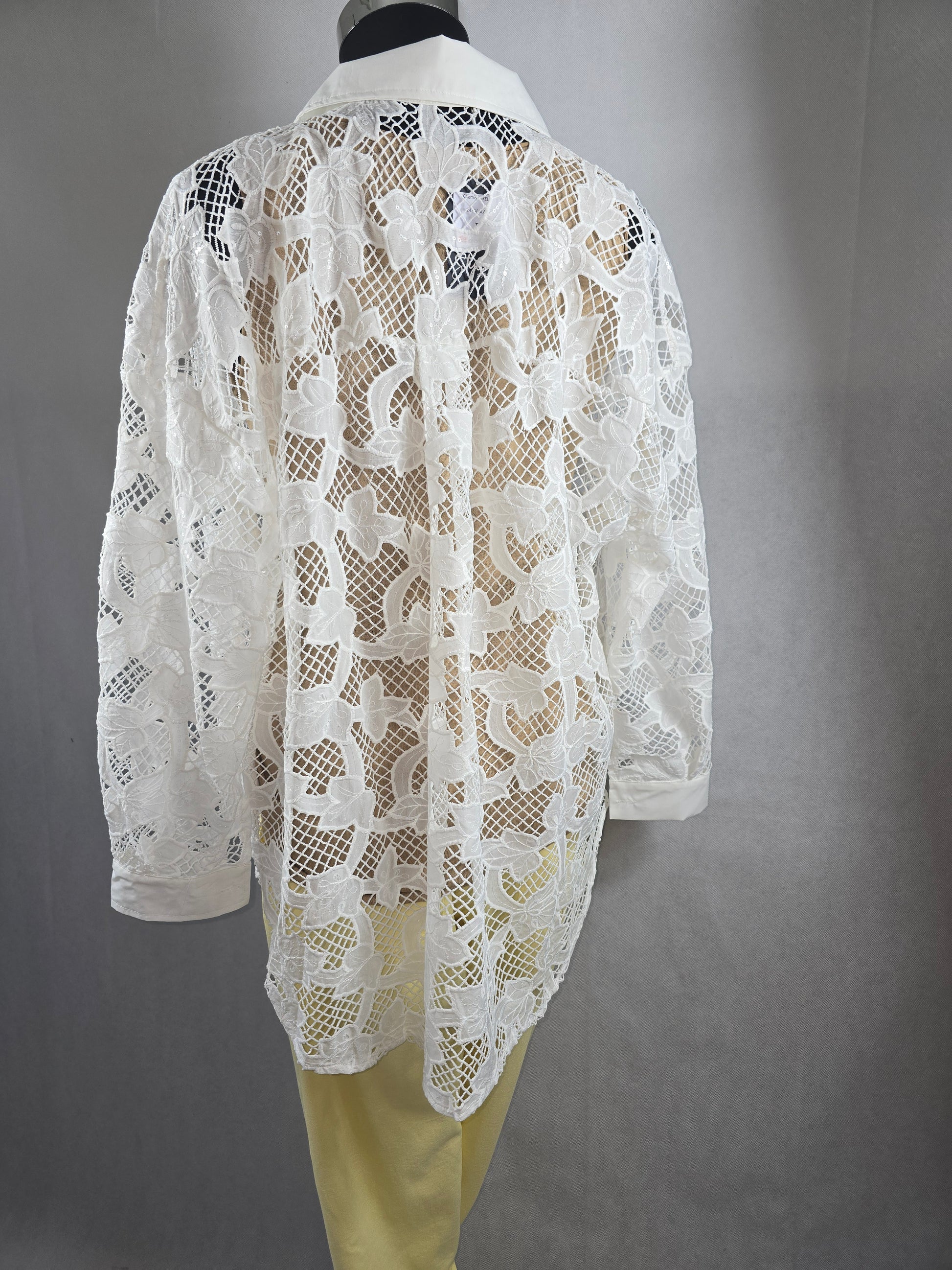 Sublimez vos tenues avec cette chemise en dentelle blanche au motif floral délicat ! Son jeu de transparence et ses boutons scintillants apportent une touche d'élégance unique. Parfaite pour superposer sur un top uni ou un maillot de bain.