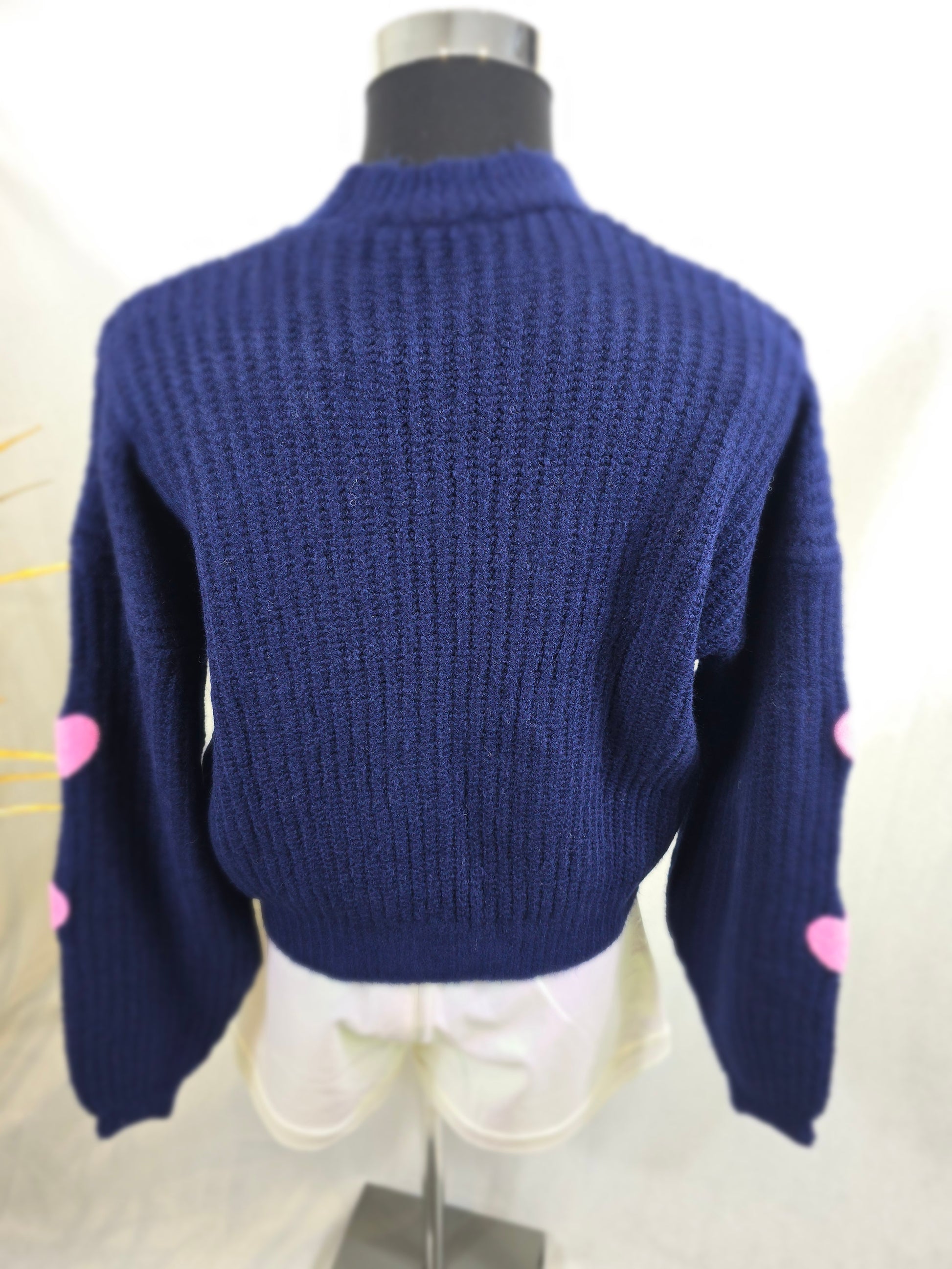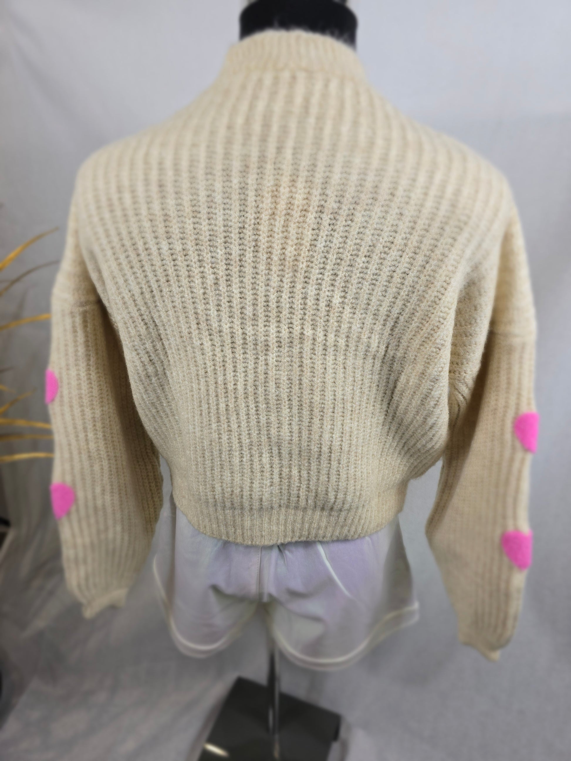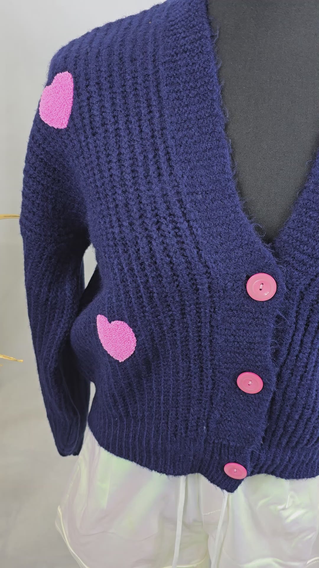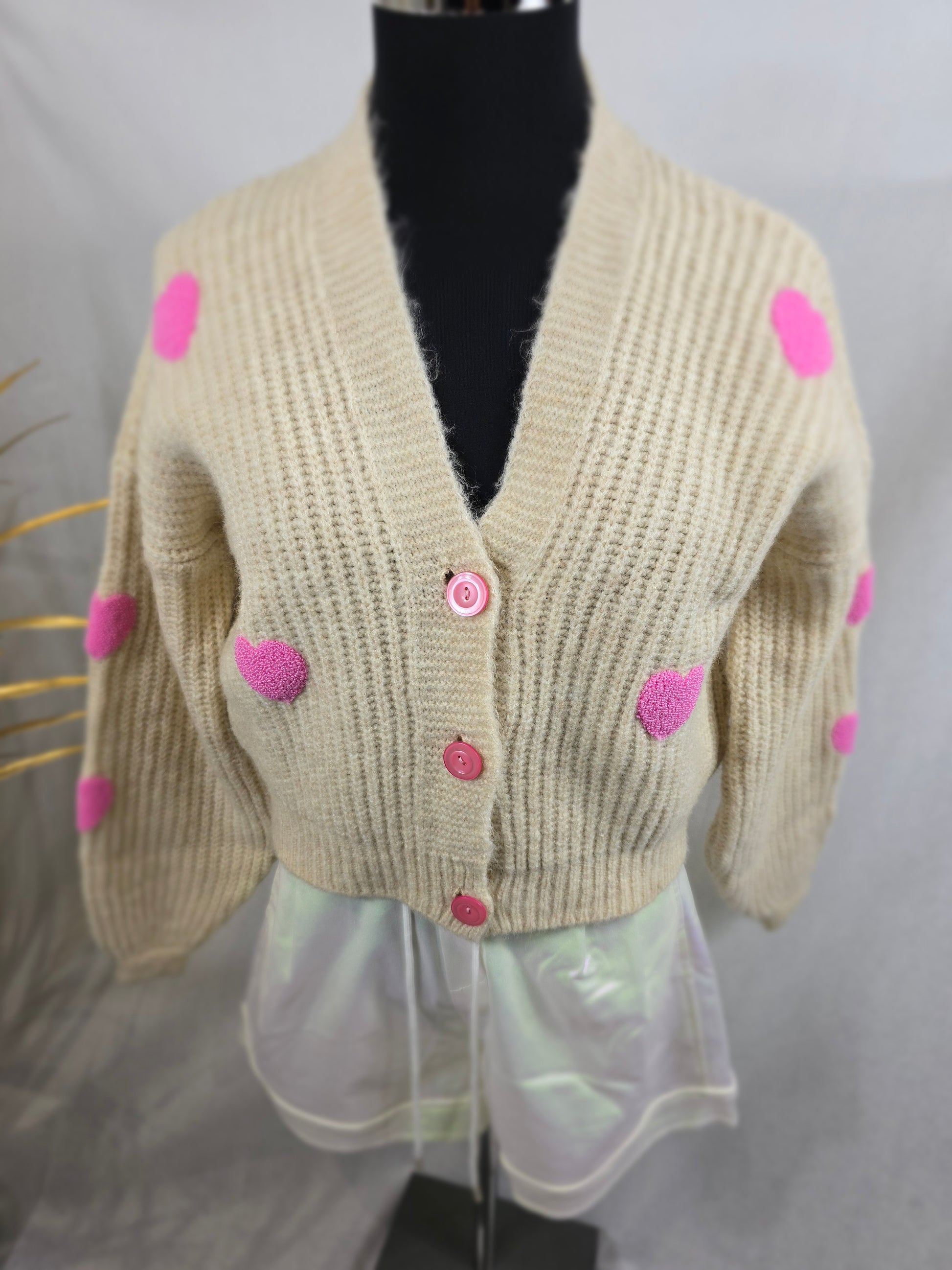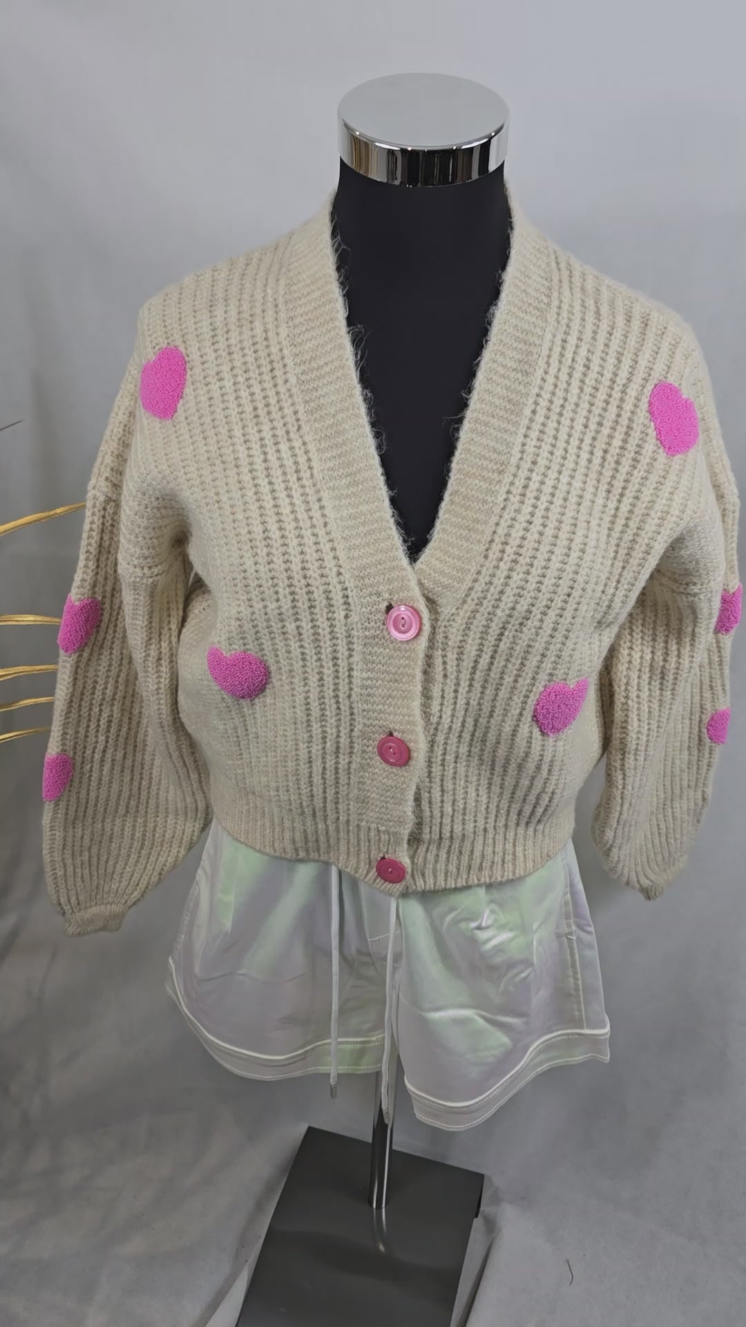 Jaquette-Pull à cœur beige-rose ou marine-rose avec boutons