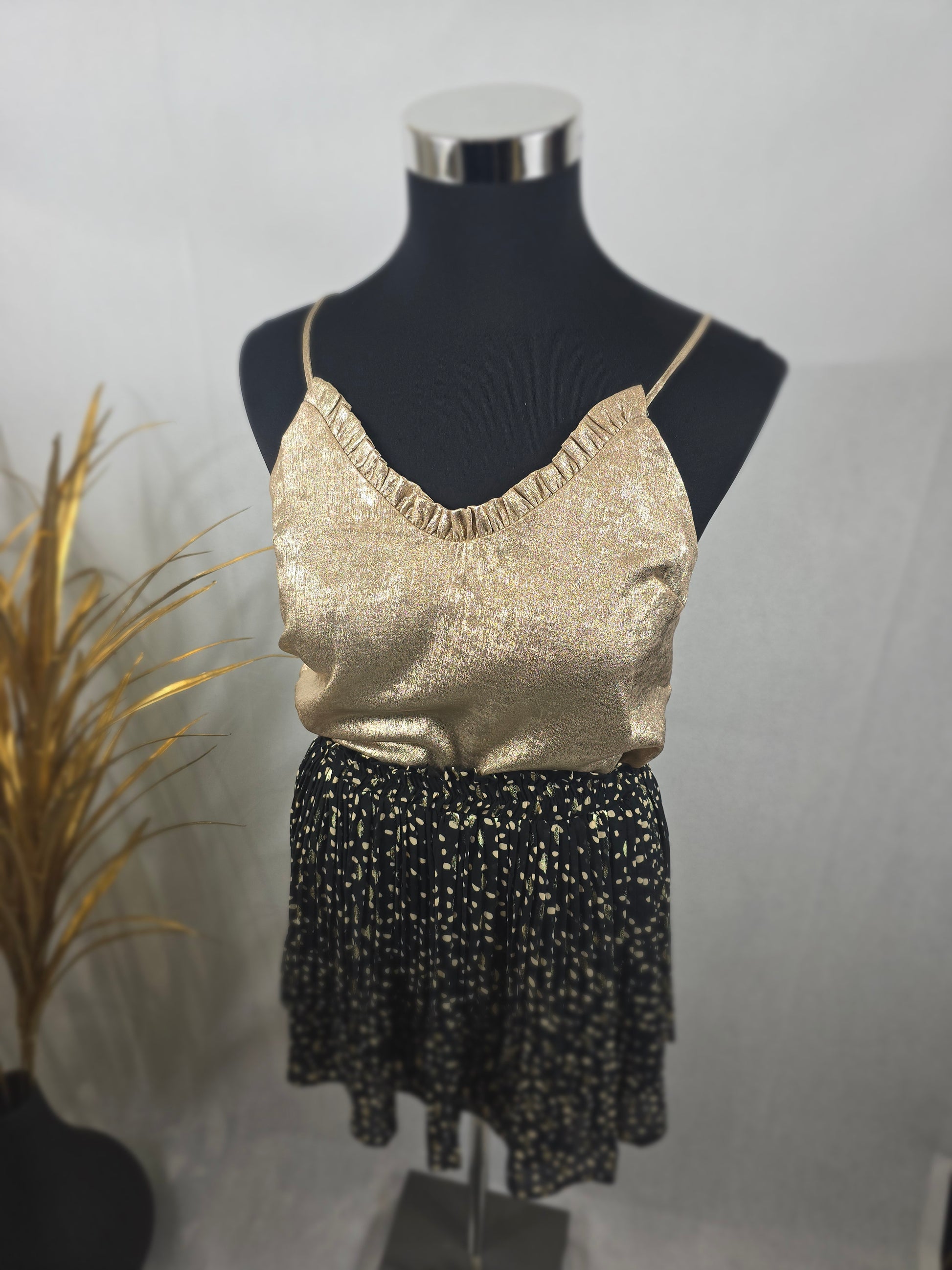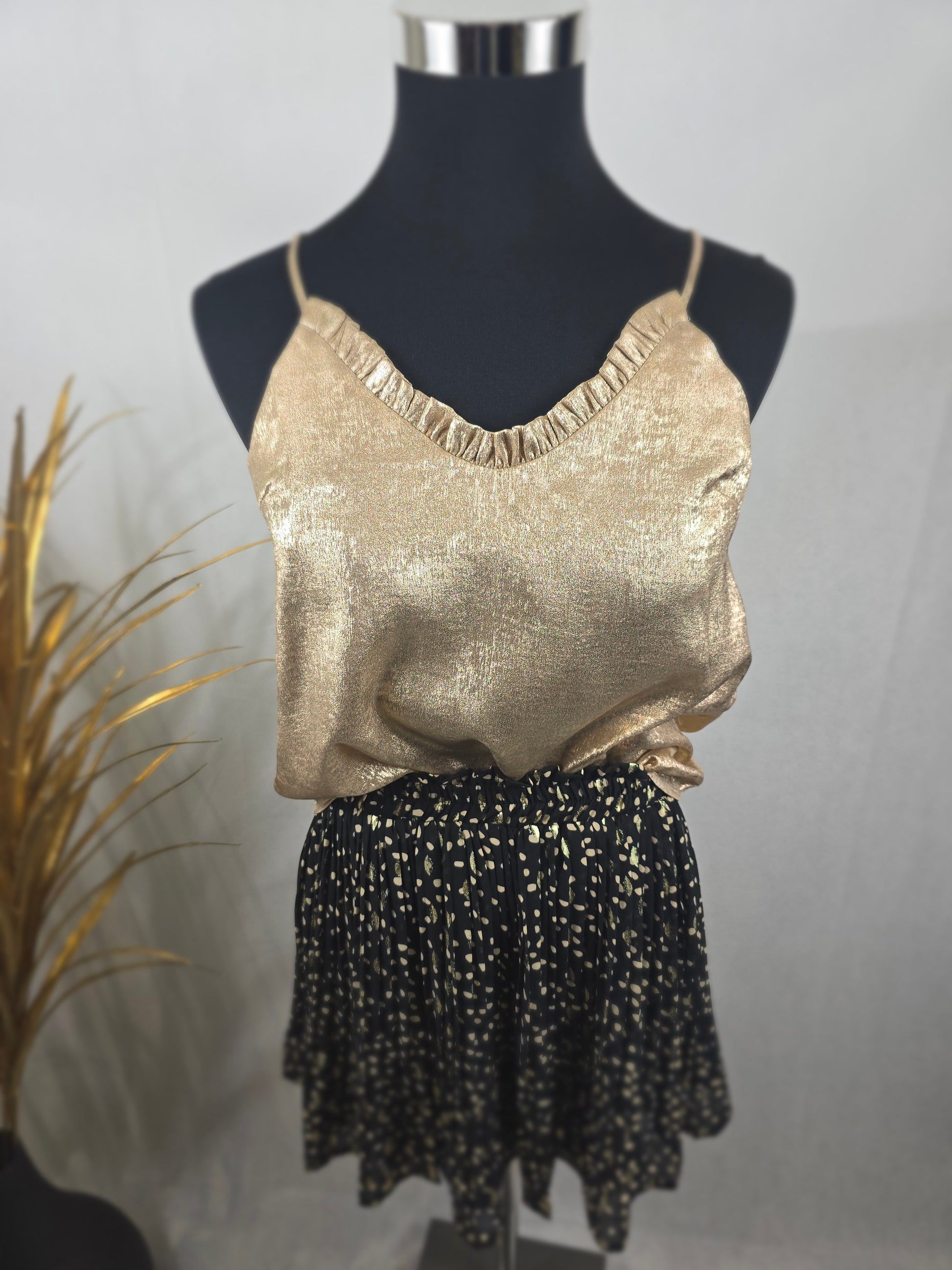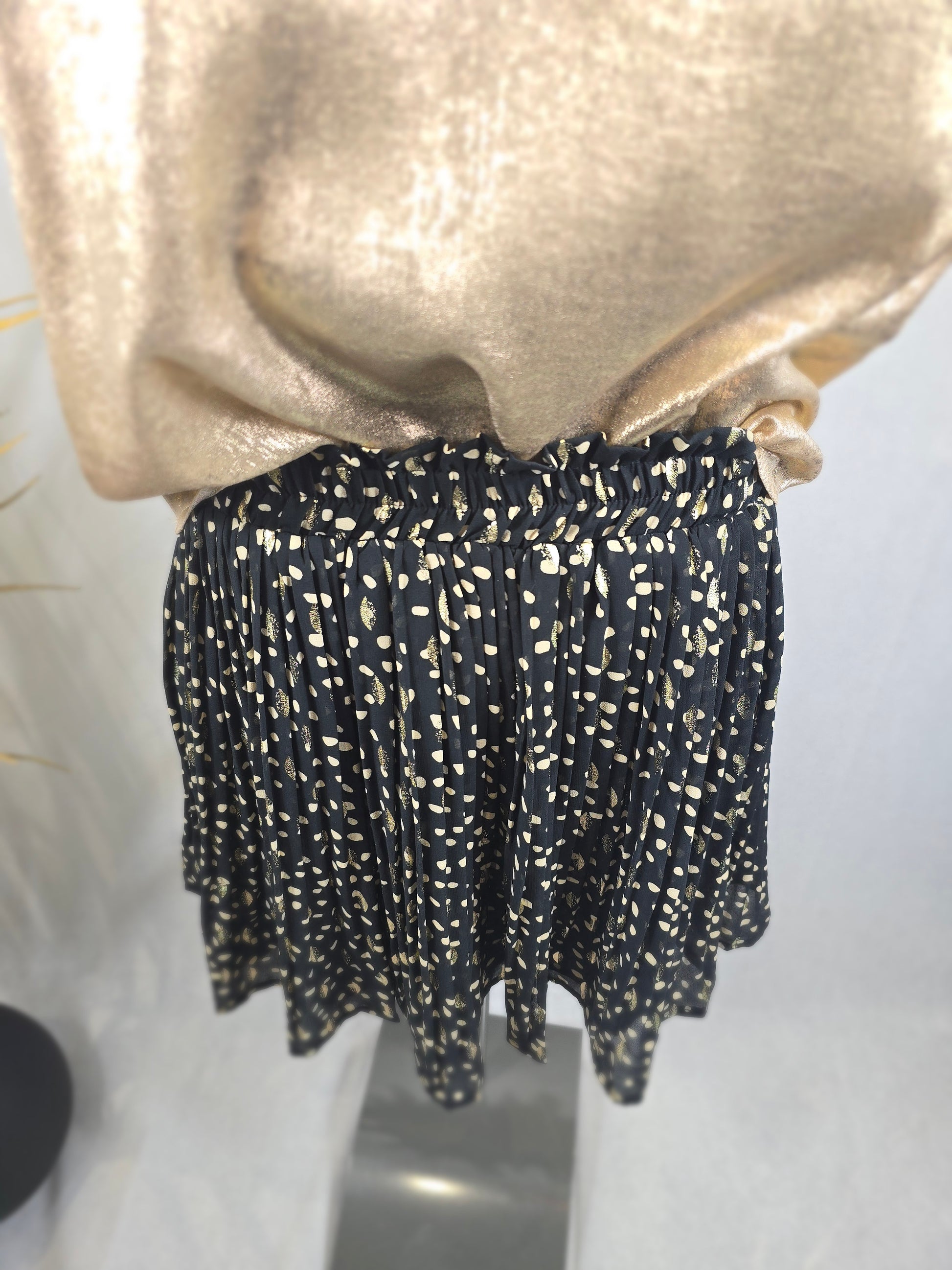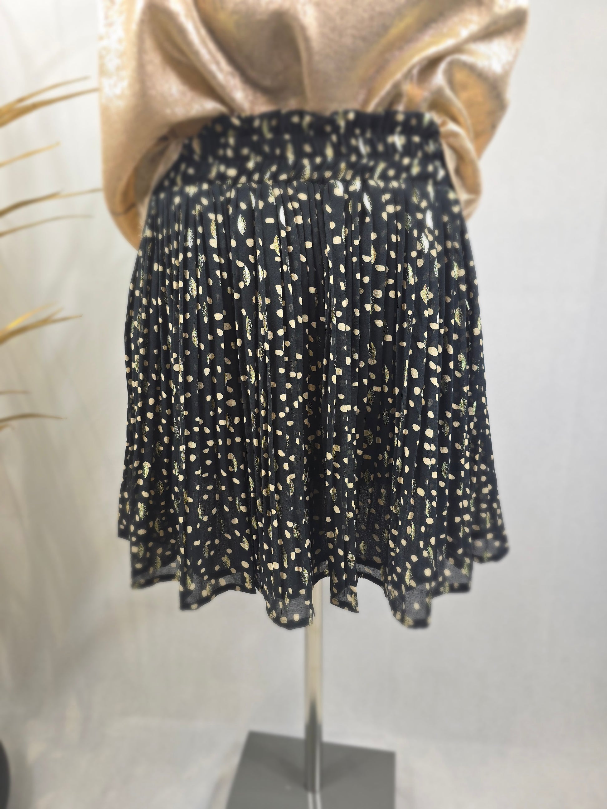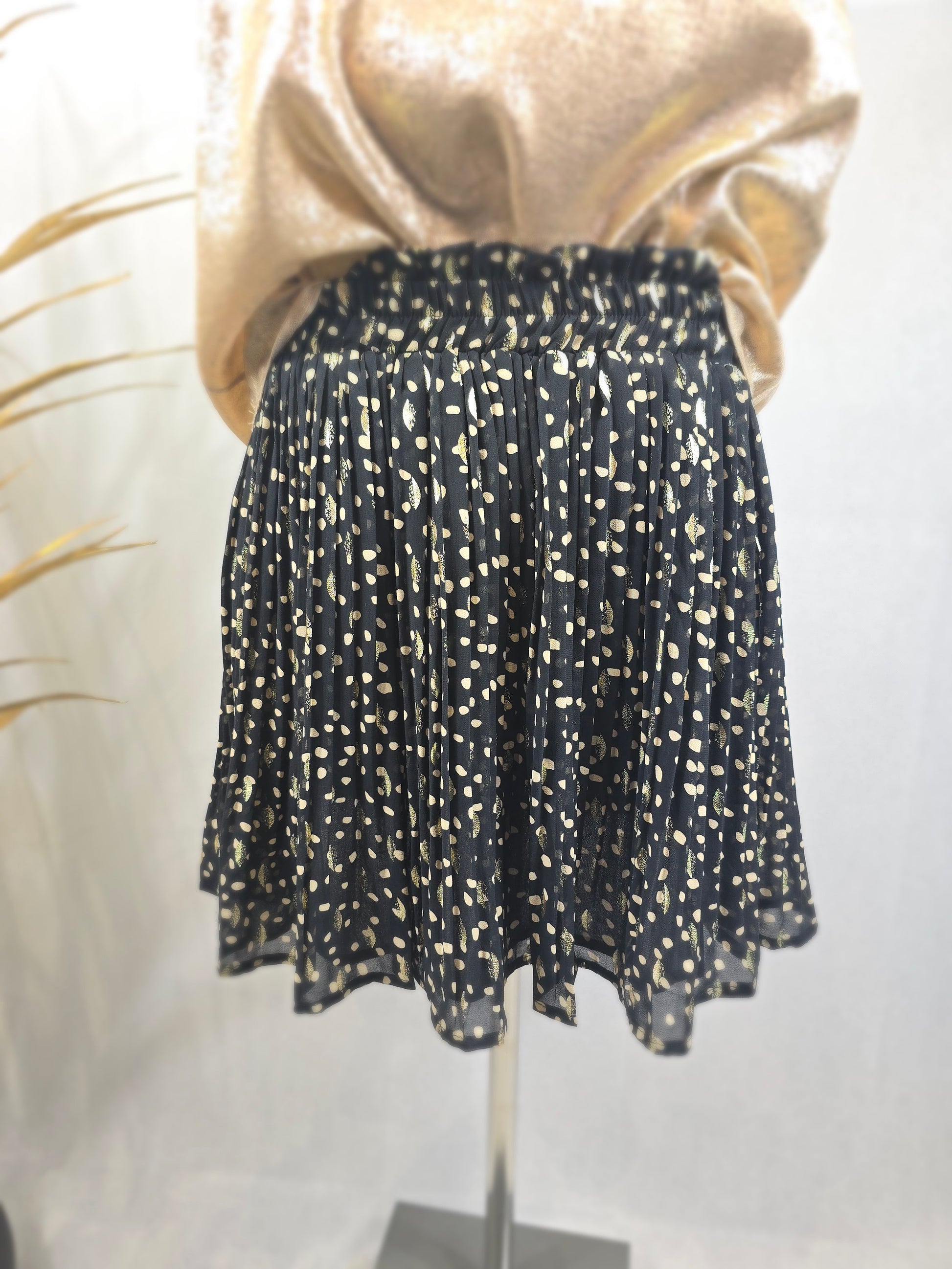 Sublimez votre tenue avec la jupe AVA noire-dorée avec taille élastique. Confectionnée en 100% polyester, cette jupe noire est ornée de motifs dorés pour une allure chic et sophistiquée. Sa coupe flatteuse et son design raffiné en font une pièce idéale pour des occasions spéciales ou pour ajouter une touche glamour à vos looks du quotidien. Un must-have pour une garde-robe élégante et féminine.