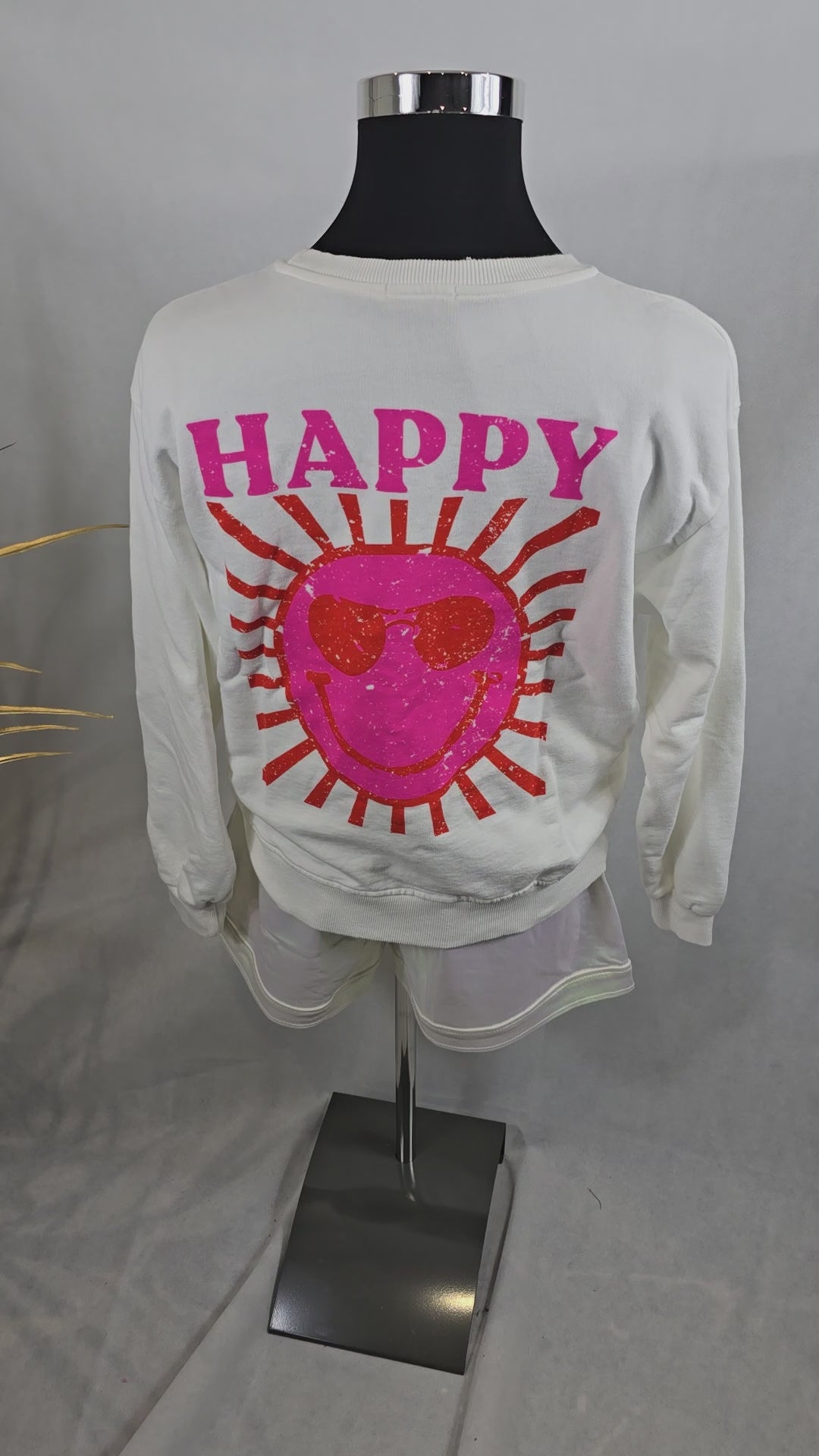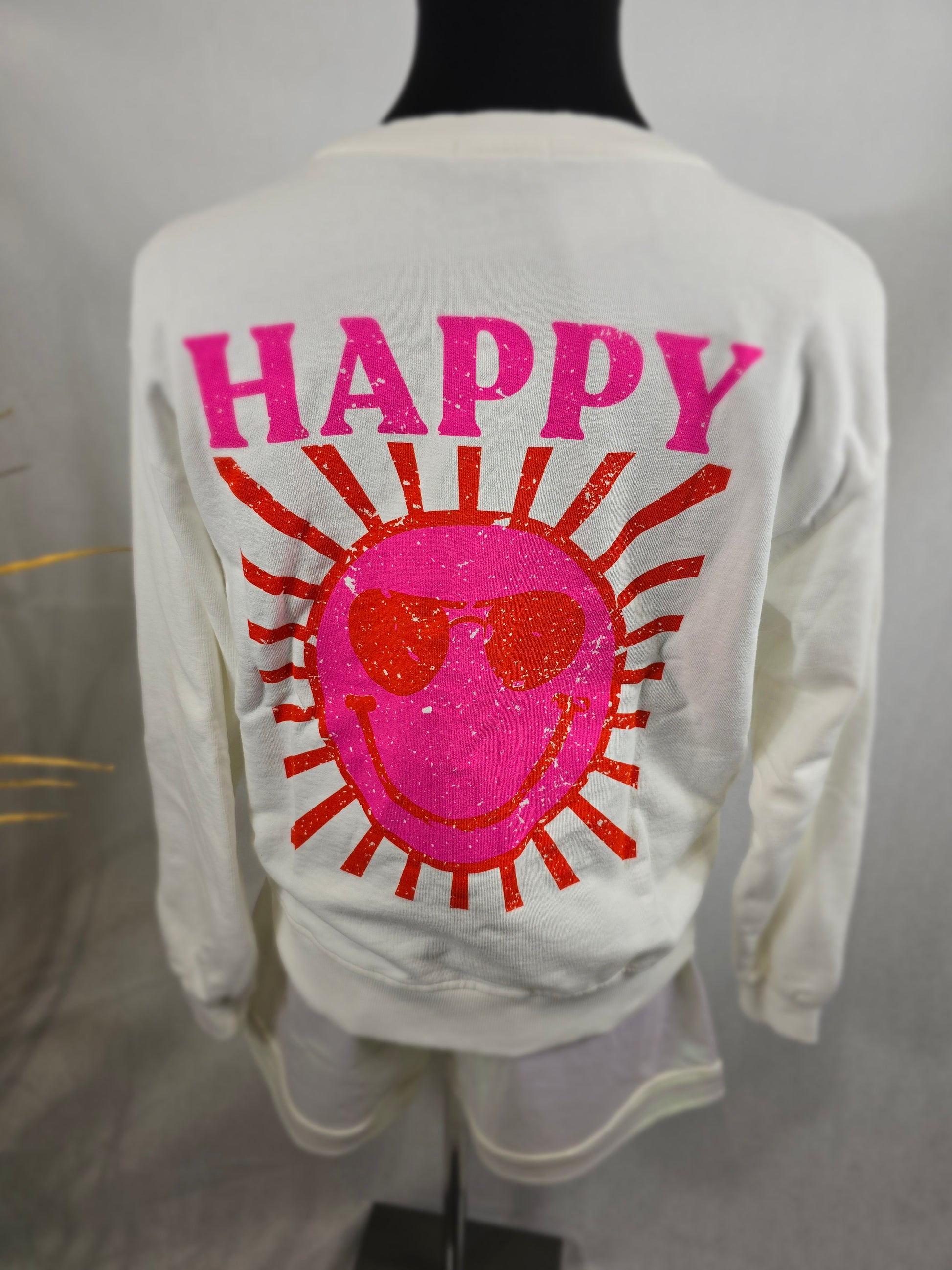 Affichez votre bonne humeur avec le pull "HAPPY" blanc, orné d'une inscription "HAPPY" imposante à l'arrière. Ce modèle taille unique est confectionné en 100% coton, offrant une douceur incomparable et un confort optimal tout au long de la journée. Fabriqué en Italie, il allie qualité et style. Ce pull moderne et dynamique est parfait pour un look décontracté et tendance, tout en apportant une touche positive à vos tenues.
