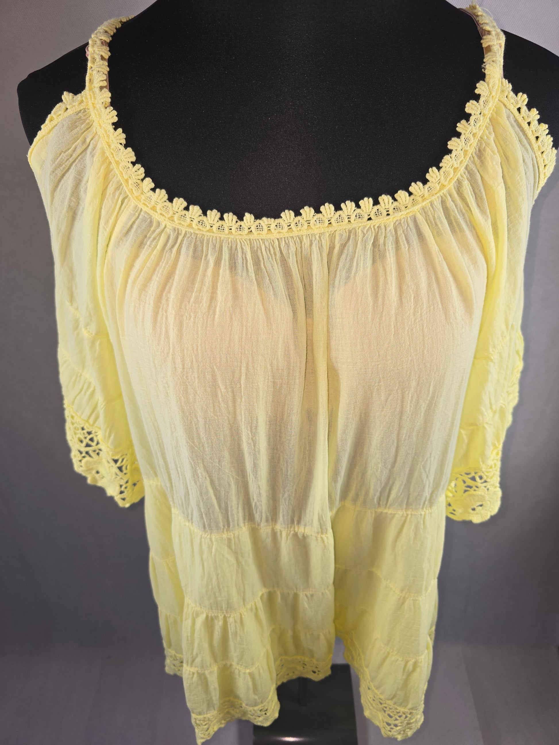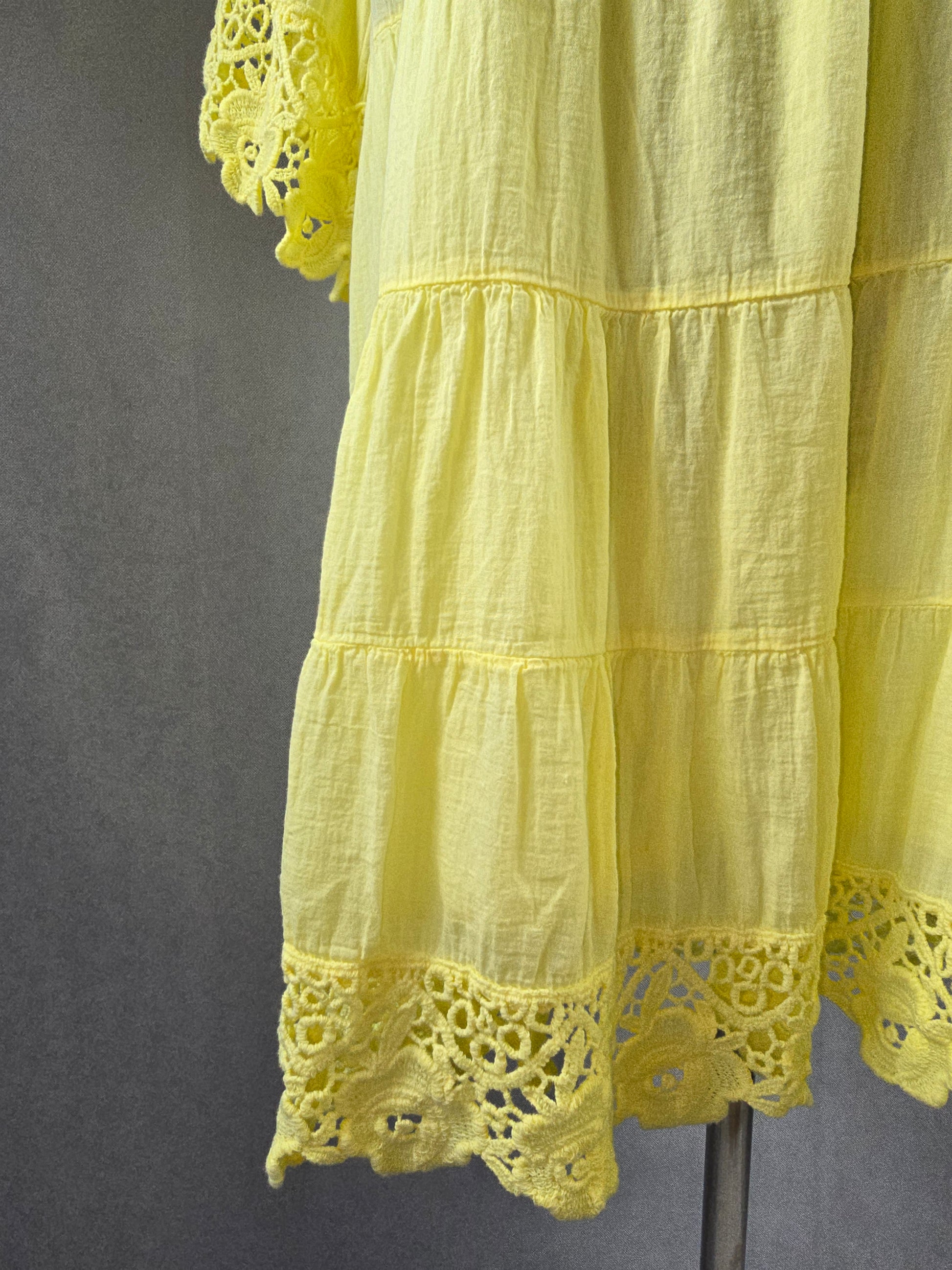 Illuminez vos journées avec cette adorable robe jaune 100% coton ! Ses épaules dénudées et ses délicats détails en dentelle au crochet lui confèrent un look bohème-chic irrésistible. Parfaite pour une balade ensoleillée ou un brunch estival.