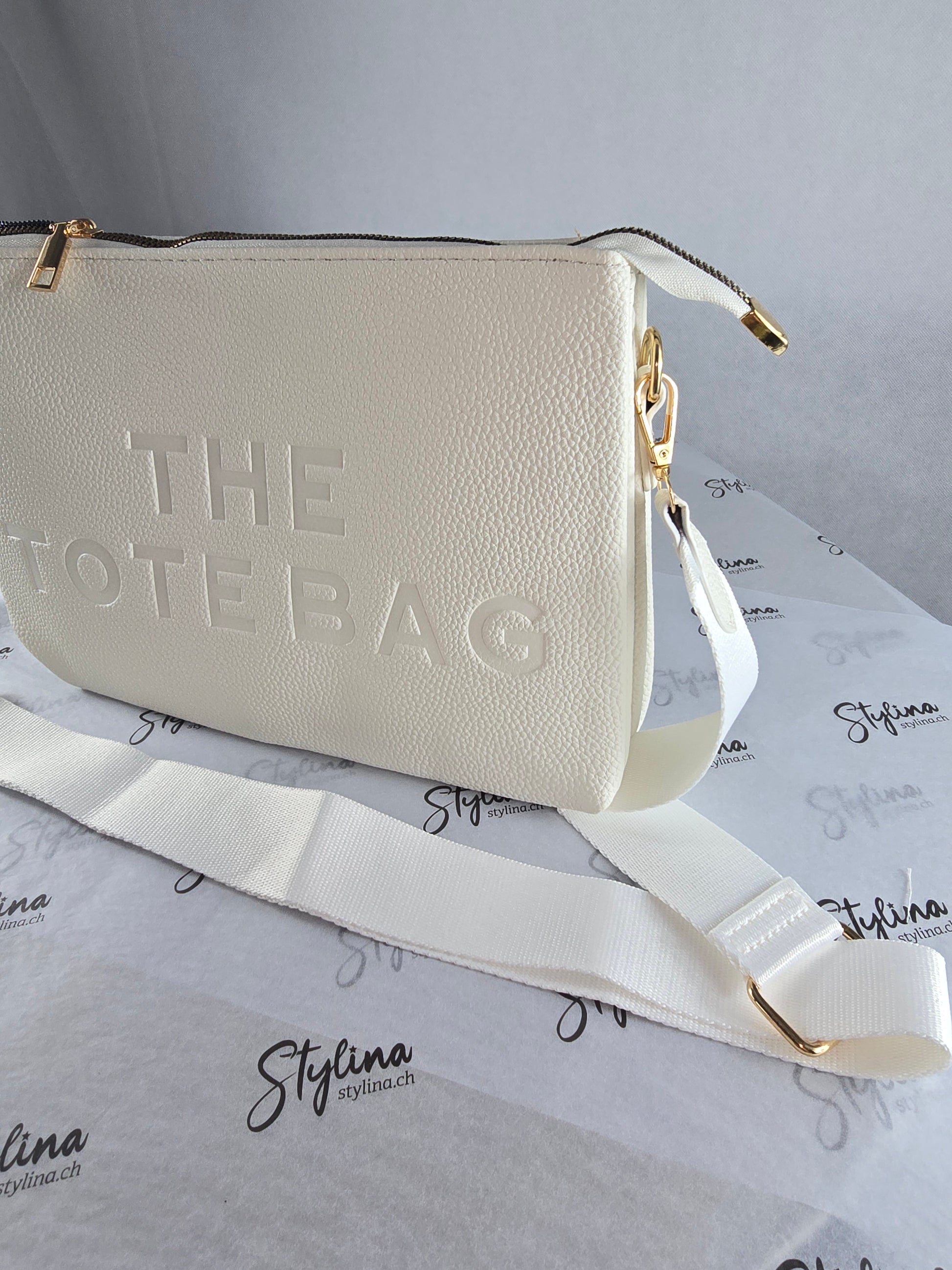 Détails : Lettrage embossé THE TOTE BAG à l’avant
