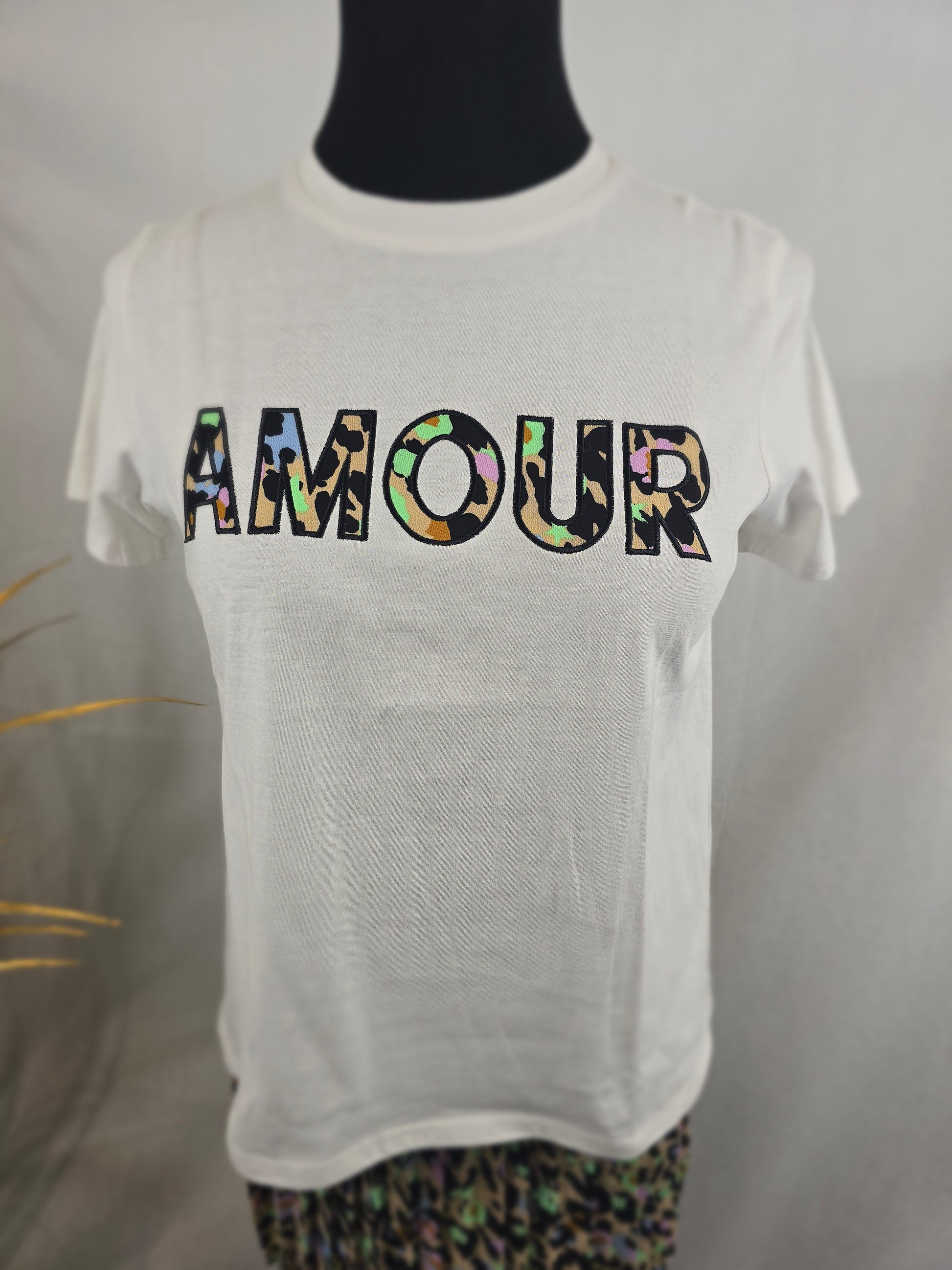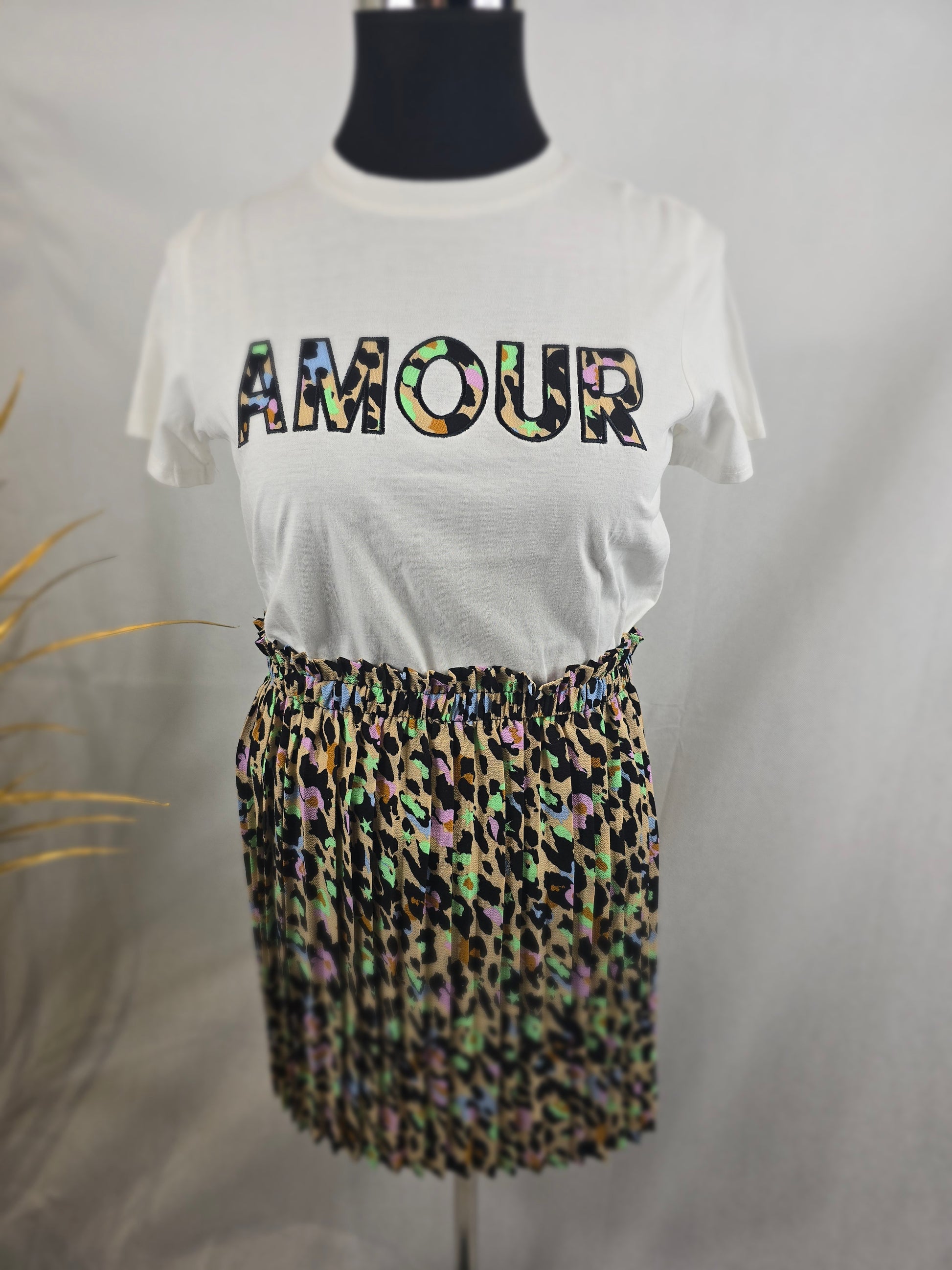 Exprimez votre personnalité avec ce t-shirt 100% coton au design unique. Arborant le mot "Amour" écrit en imprimé léopard tacheté de vert, beige, bleu, orange et rose, ce modèle est parfait pour un look audacieux et tendance. Confortable et respirant, ce t-shirt se prête aussi bien à une tenue décontractée qu’à un style plus affirmé. Un mélange de douceur et d’originalité pour faire ressortir votre amour de la mode avec élégance.