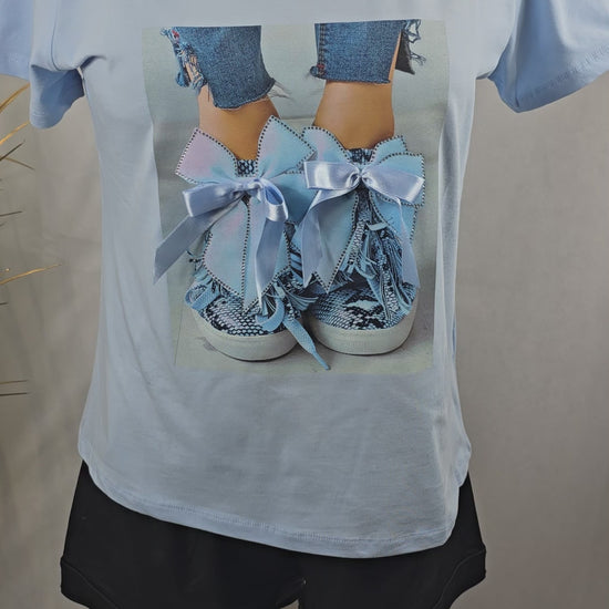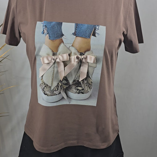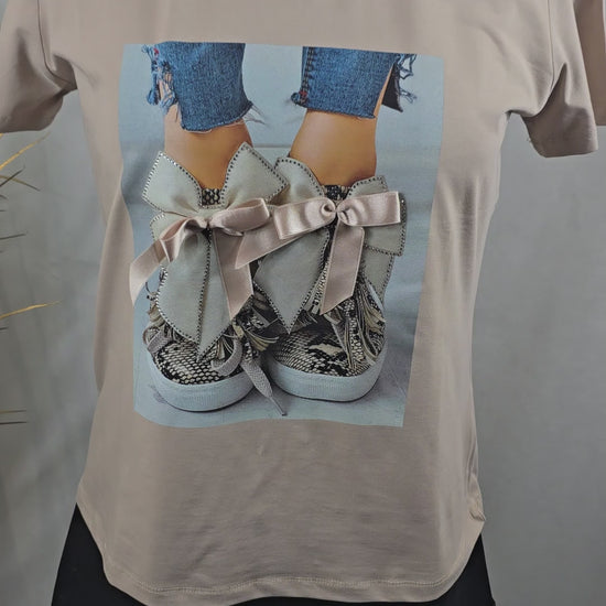 Ajoutez une touche de style à votre garde-robe avec ce t-shirt original, orné d’un dessin de baskets, de nœuds et de strass. Disponible en trois couleurs modernes – beige, brun et bleu ciel – il combine confort et éclat pour un look à la fois décontracté et chic. Confectionné dans un mélange de 75% viscose, 20% polyester et 5% élasthanne, ce t-shirt est doux, léger et offre une grande liberté de mouvement. Fabriqué en Turquie, il est conçu pour offrir qualité et durabilité. Parfait pour un look casual, ce t-shirt peut facilement être porté avec un jean ou une jupe pour une tenue à la fois dynamique et élégante.