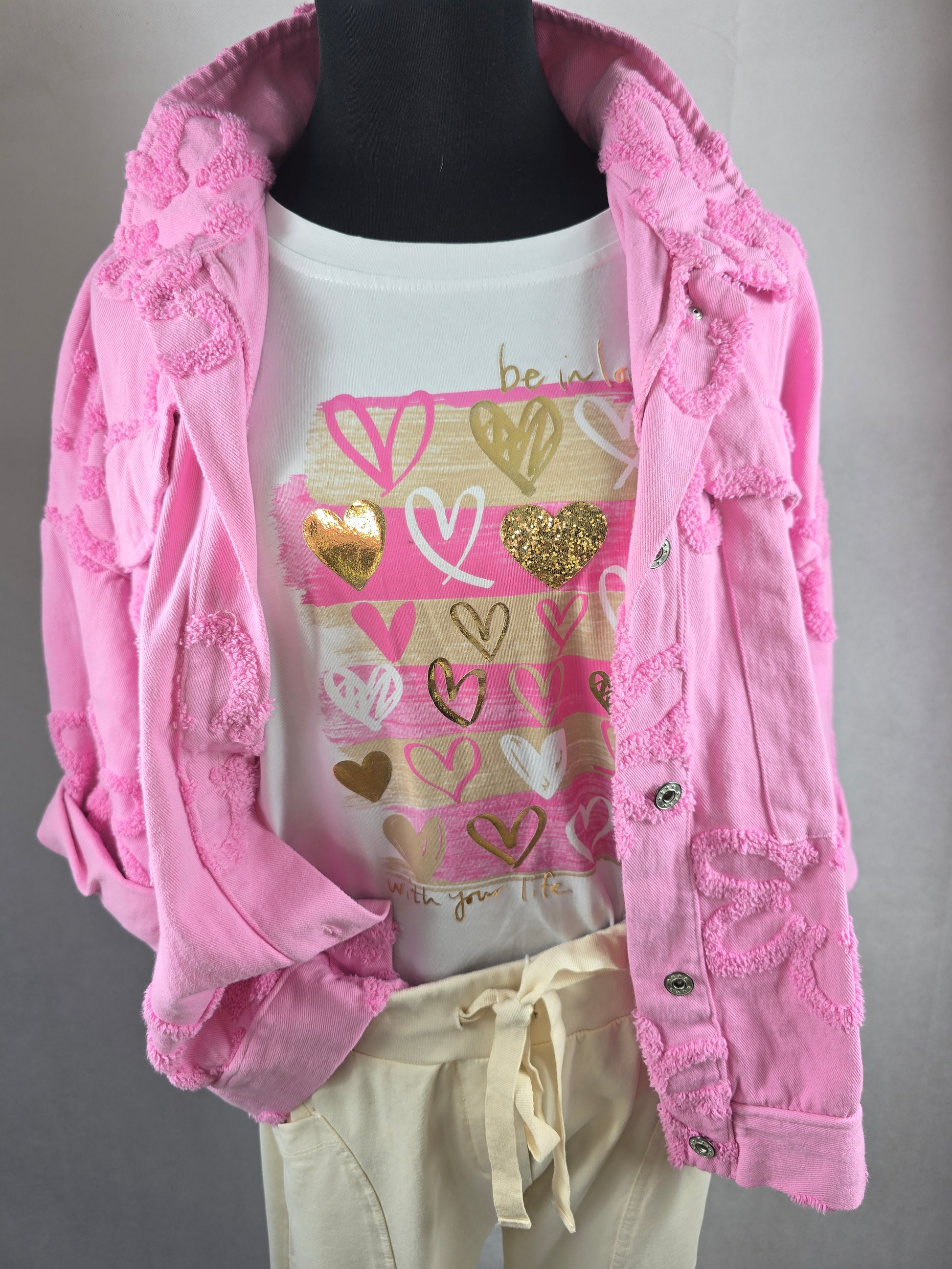 Affichez votre amour de la vie avec ce t-shirt blanc super mignon ! Ses cœurs dorés et roses pailletés apportent une touche de fantaisie irrésistible. Parfait pour illuminer votre quotidien. Ultra confortable et légèrement extensible (95% coton, 5% élasthanne).